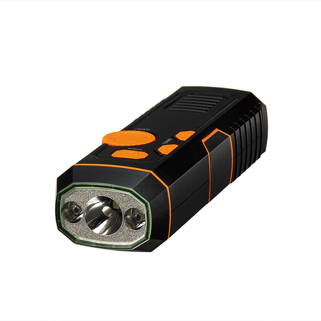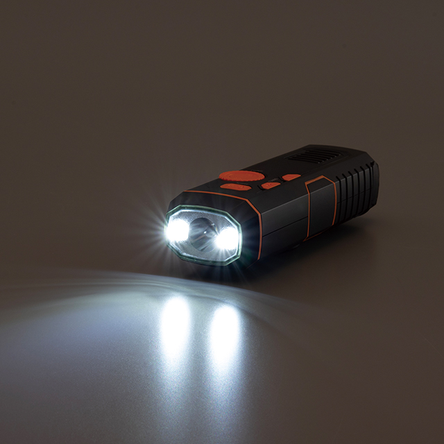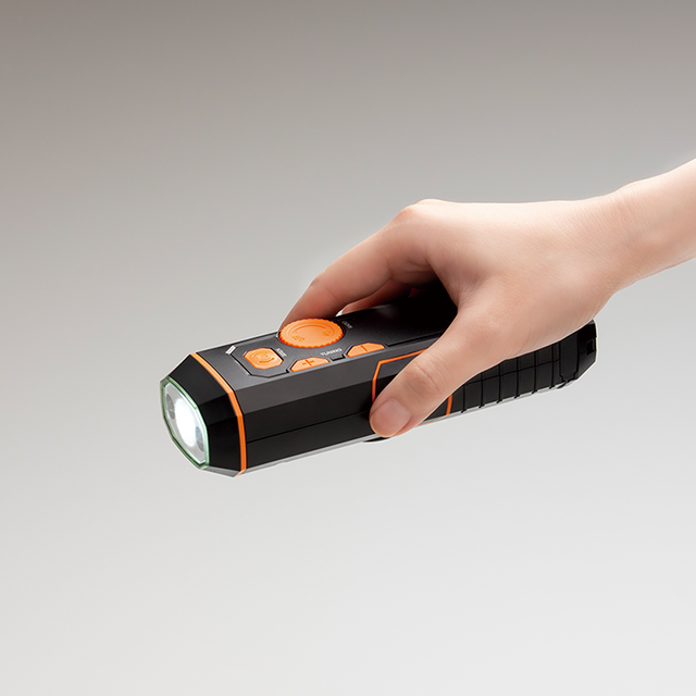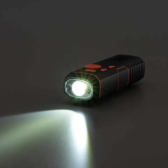 2モードLEDライト、ラジオ、SOS、チャージャ、ダイナモの多機能防災/アウトドア用品です。
