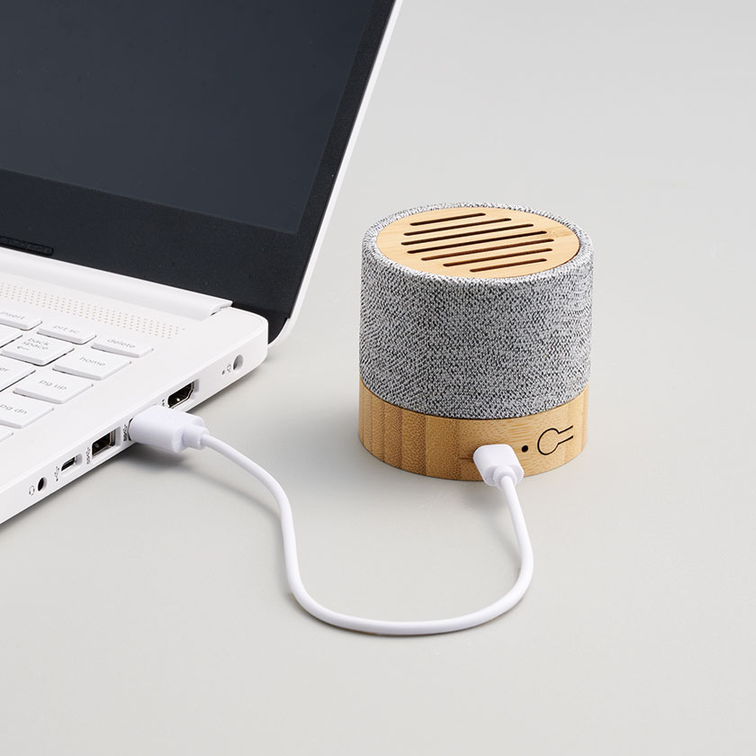 竹とペットボトルをリサイクルしてできた生地を組み合わせた、環境にやさしいミニスピーカーです。