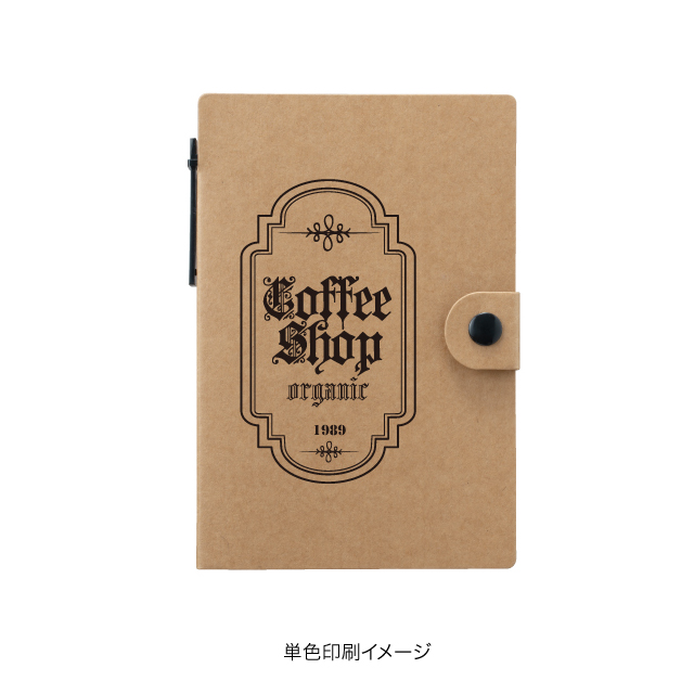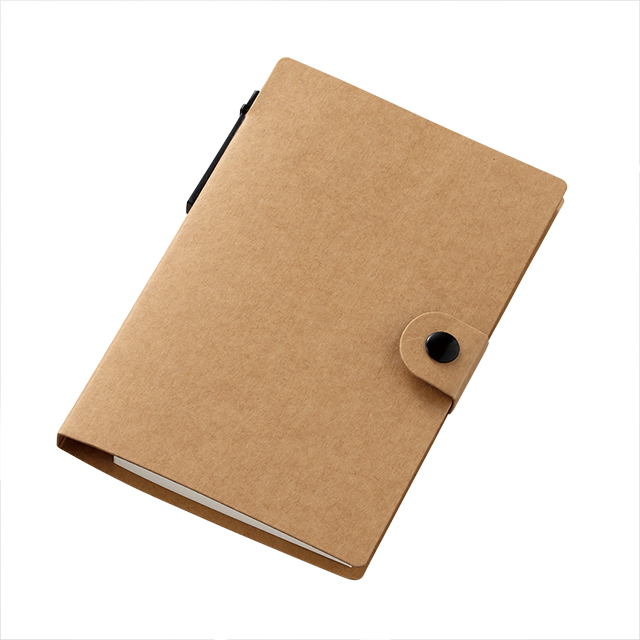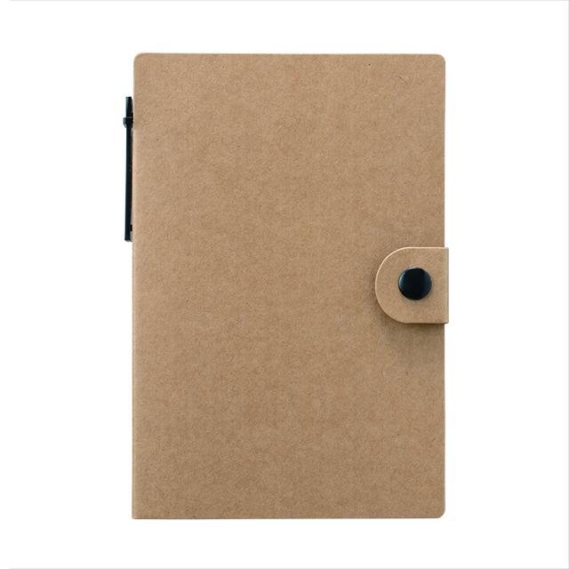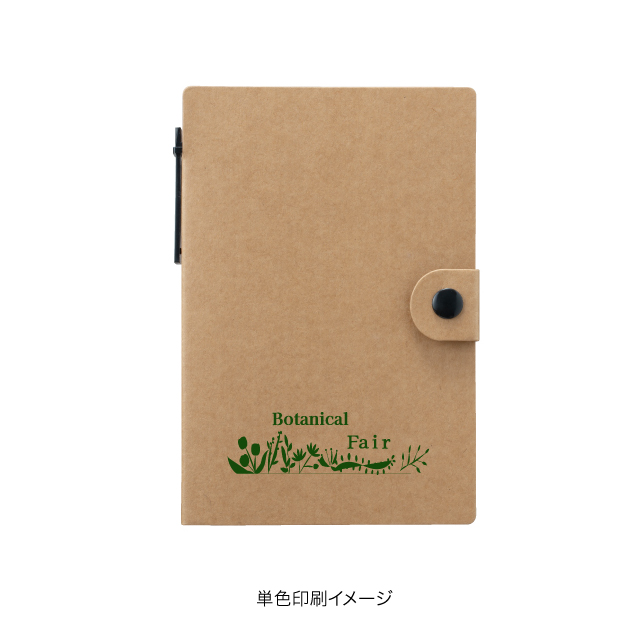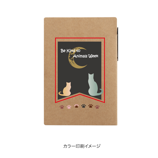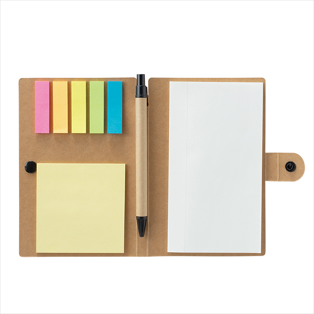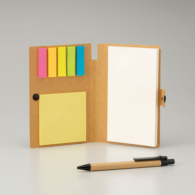 表紙に再生クラフトを使用した環境に優しいアイテムで、蛍光カラーがカラフルな5色の付箋と中サイズの付箋がついています。