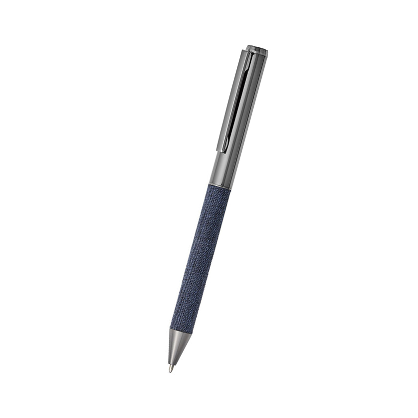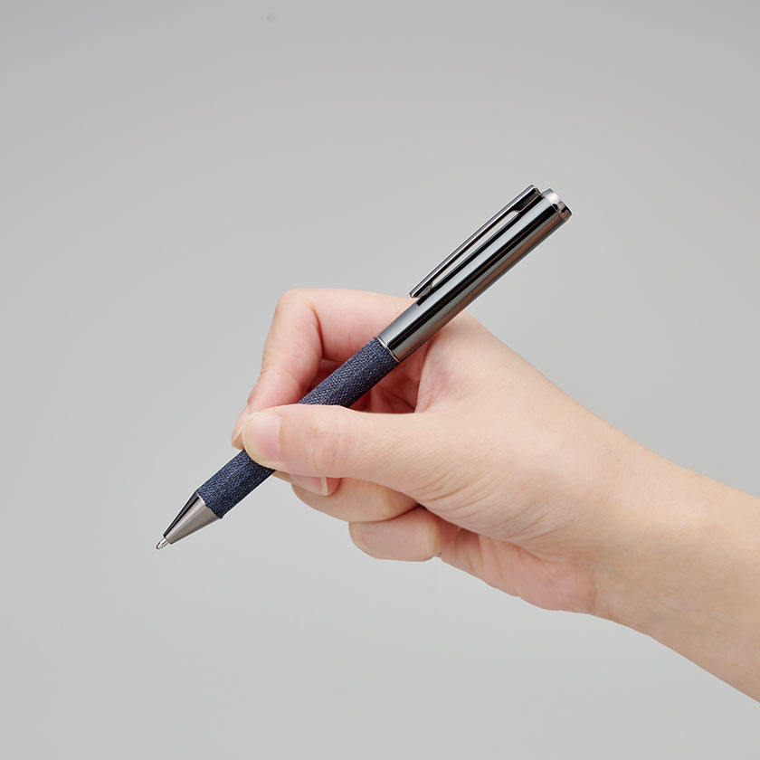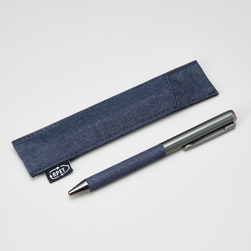 ペットボトルをリサイクルしてできた生地を使用した、オシャレなデザインが特徴のボールペン。